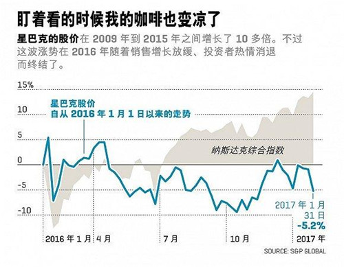 就連舒爾茨本人也說,星巴克的股票走勢有些不穩(wěn)。從2009年起到2015年,公司的股價(jià)增長了1,170%,而在2016年則跌去了8%,這是自從2008年以來的首次下跌—盡管大盤上漲了10%。令人沮喪的是,下跌竟然找不到很明確的原因。有些懷疑指向了銷售增長放緩、舒爾茨(第二次)宣布從首席執(zhí)行官的位置上退休后領(lǐng)導(dǎo)層的不確定性、甚或是這家總部位于西雅圖的公司制定了依靠海外市場的發(fā)展計(jì)劃,而特朗普執(zhí)政后給跨國經(jīng)營帶來了不確定因素。