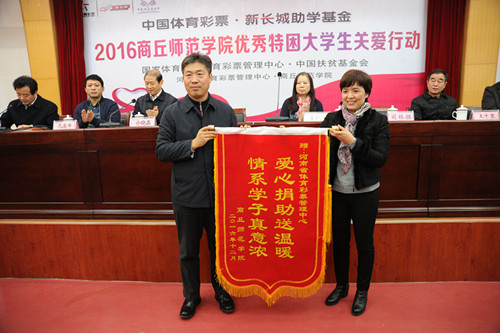 在商丘師范學(xué)院捐贈(zèng)儀式上,河南省體育彩票管理中心書記王海新介紹,2016年是河南省體彩中心連續(xù)第四年進(jìn)行“中國體育彩票?新長城助學(xué)基金”助學(xué)活動(dòng)。經(jīng)過河南省體彩中心和中國扶貧基金會(huì)共同審核,選定我省欠發(fā)達(dá)的豫東地區(qū)的周口師范學(xué)院、商丘師范學(xué)院兩所學(xué)校,作為河南省體彩中心2016年“中國體育彩票?新長城助學(xué)基金”的受助學(xué)校。本次捐助活動(dòng)對來自兩所院校的120名2016級優(yōu)秀貧困大學(xué)生進(jìn)行捐助,總捐助金額60萬元。至此,河南省體彩中心在該公益項(xiàng)目上累計(jì)投入的捐助貧困大學(xué)生的資金達(dá)到124萬元,共有280名貧困大學(xué)生和家庭受益。