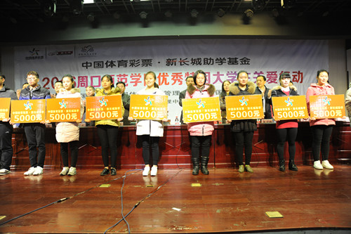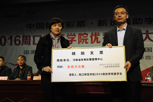 2016年12月7日、8日,中國體育彩票品牌公益項(xiàng)目“中國體育彩票新長城助學(xué)基金”2016年捐贈(zèng)儀式分別在商丘師范學(xué)院和周口師范學(xué)院舉行。據(jù)悉,通過此次捐贈(zèng)活動(dòng),河南省體育彩票管理中心共向兩個(gè)學(xué)校來自全國14省區(qū)的120名優(yōu)秀貧困大學(xué)生每人捐助5000元,幫助他們和他們的家庭,減輕學(xué)習(xí)生活中的經(jīng)濟(jì)負(fù)擔(dān)。
