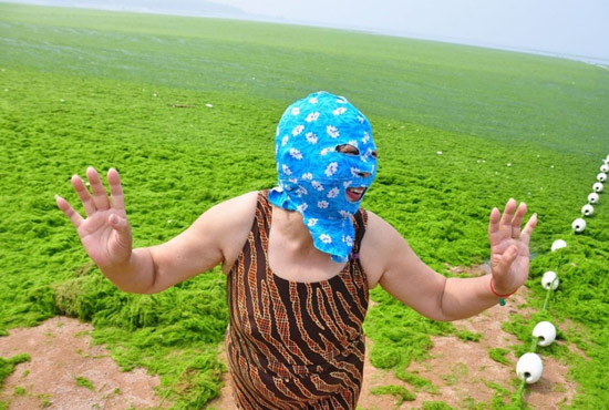 2013年7月3日,山東青島青島高溫來襲,“青島大媽”不懼滸苔,戴著“強盜面具”出現(xiàn)在海水浴場消暑降溫。CFP