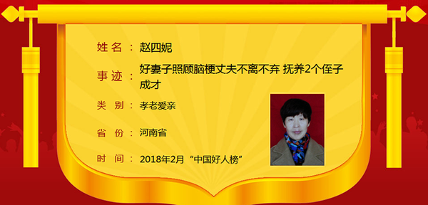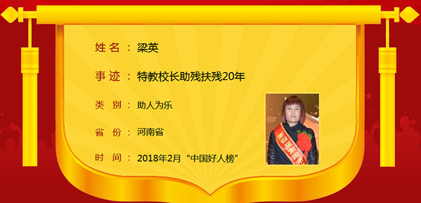 大河網(wǎng)訊 3月4日,2018年2月“中國好人榜”發(fā)布,共有101位助人為樂、見義勇為、誠實守信、敬業(yè)奉獻、孝老愛親的身邊好人榮登該榜,河南省共有6位好人光榮上榜。他們分別是助人為樂好人:助殘扶殘20年的特教校長梁英。見義勇為好人:冬夜聯(lián)手相救落水老人的基層干部韓俊杰、李紅衛(wèi)。敬業(yè)奉獻好人:細(xì)心照料老人10余年的愛心男護理蔣禹成。孝老愛親好人:照顧腦梗丈夫不離不棄,撫養(yǎng)2個侄子成才的好妻子趙四妮;30年悉心照料智障小姑的好嫂娘單二服。