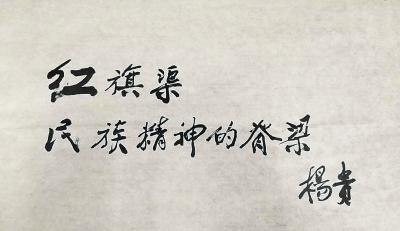 采訪結(jié)束時,楊老不顧身體勞累,為“大河報紀(jì)念紅旗渠通水50周年特刊”題寫刊名:“紅旗渠民族精神的脊梁”。