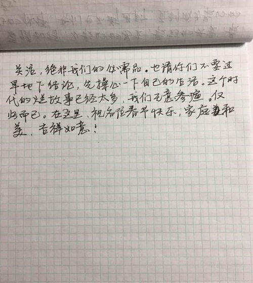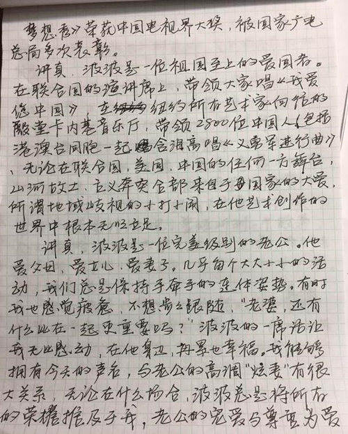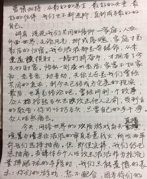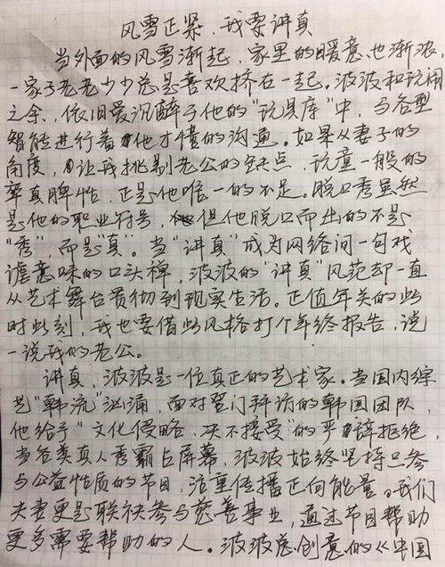 網(wǎng)易娛樂(lè)1月26日?qǐng)?bào)道 日前,演員周立波在美國(guó)長(zhǎng)島因涉嫌持有槍支、藏有毒品而被美國(guó)警方逮捕,在繳納保釋金后獲得保釋。此前周立波先是在美國(guó)通過(guò)媒體表示“持有的槍支合法,毒品并非其所有。之后還曾發(fā)微博自證“事實(shí)和法律將還我清白”。而就在1月26日早上,周立波妻子胡潔通過(guò)微博發(fā)布自己的一封手寫(xiě)信,力贊丈夫周立波“完美”。對(duì)于近日的是非,她更表示“請(qǐng)不要過(guò)早下結(jié)論,先操心自己的生活”。