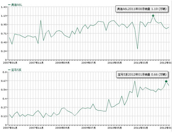 奧迪A6的成功奠定了奧迪在國(guó)內(nèi)的品牌基礎(chǔ),也一直是奧迪銷售的主力車型。從2011年開(kāi)始,奧迪A6L的月銷量就穩(wěn)定在萬(wàn)輛左右,2011年奧迪A6L全年總銷量為11.2萬(wàn)臺(tái),超過(guò)了它的兩個(gè)最強(qiáng)對(duì)手寶馬5系(6.49萬(wàn))、奔馳E級(jí)(4.47萬(wàn))的銷量之和,占到了奧迪在華銷量的36%。也就是說(shuō)每賣出去三輛奧迪,其中必有一輛是奧迪A6L。