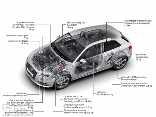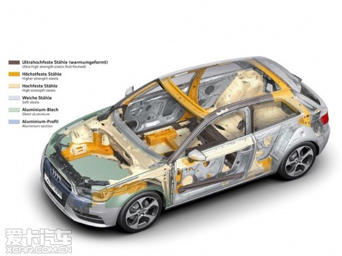 “輕量化”之于奧迪,已然成為品牌精髓所在,截止2011年已有70萬輛裝備了AFS輕質(zhì)車架的奧迪汽車駛下生產(chǎn)線。全新一代奧迪A3相比老款的減重達到了80千克,首當其沖的就是采用了復(fù)合材料車架,車架型材包括了奧迪擁有自主知識產(chǎn)權(quán)的:超硬鋼、先進高強度鋼、高強度鋼、低碳鋼以及鋁板。這些不同材料通過多種連接方式構(gòu)成了強度大幅提升的車身,同時重量下降了18千克。而大眾集團最新的“MQB”橫置發(fā)動機模塊化平臺則能夠幫助奧迪A3進一步減輕重量,比如A3使用的前輪鋁制副車架就帶來了6千克的減重效果。