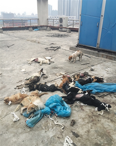 5日,西安醫(yī)學院一實驗樓樓頂上,數(shù)十只狗身上滿是傷痕,有的疼得抽搐。愛心志愿者供圖