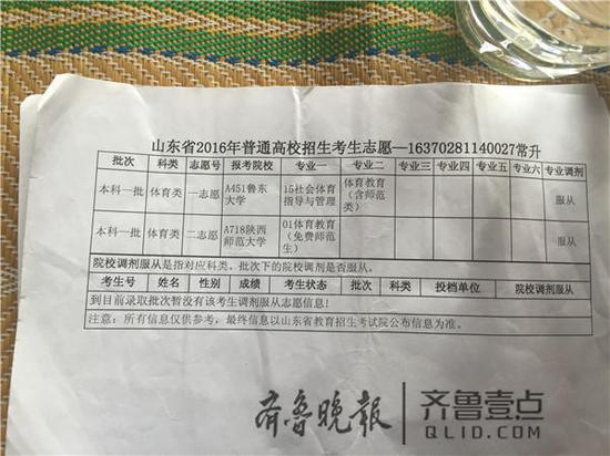 陜西師范大學(xué)在山東招收6名體育教育專業(yè)的學(xué)生,均為免費(fèi)師范生。第一志愿的錄取線為文化課362分,專業(yè)課66.54分。學(xué)校按照專業(yè)課成績由高到低擇優(yōu)錄取。常升的文化課考了403分,專業(yè)課考了93.64分,遠(yuǎn)超出學(xué)校的錄取線。而魯東大學(xué)官網(wǎng)顯示,該校社會體育指導(dǎo)與管理專業(yè)的文化課最低錄取分?jǐn)?shù)為407分,而常升的文化課成績差4分。不過,該校對專業(yè)課要求低,專業(yè)課成績最高分僅為77.65分。