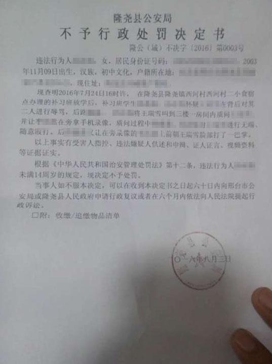 被害人家屬翻拍的一份由隆堯縣公安局對其中一名肇事學生開具的不予行政處罰決定書。7月24日下午,河北省邢臺市隆堯縣堯山中學一名初一學生,因為不愿意借錢而在補習班遭受了兩名女生長達4分鐘的辱罵、毆打,另一名學生還把整個過程用手機拍攝下來并上傳網絡,視頻在當地被瘋狂傳播。