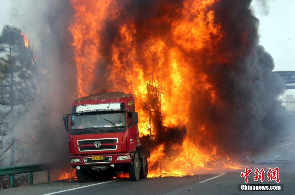 1月23日下午4時許,滬昆高速公路江西弋陽往貴溪方向593公樁(貴溪收費(fèi)站附近)一輛載有133部電動車的半掛車起火,導(dǎo)致電動車被大火“吞噬”。江西貴溪消防官兵接警后迅速到場撲救,半小時后將大火撲滅。據(jù)司機(jī)稱,火災(zāi)疑因高速護(hù)坡雜草叢起火產(chǎn)生的火芯飄至半掛車,引燃包裝電動車的紙殼箱所致。中新社發(fā) 龔武 攝