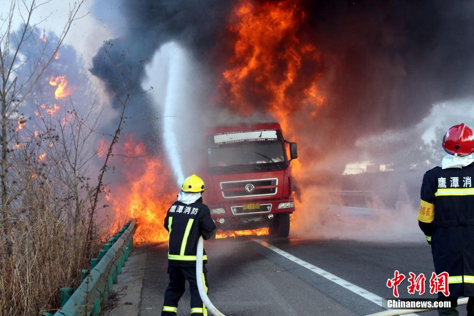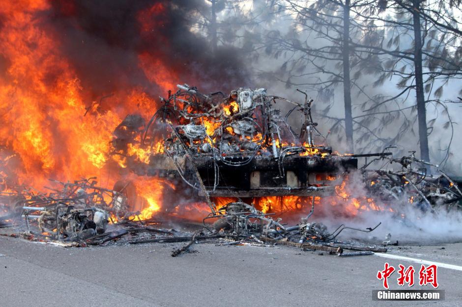 1月23日下午16時許,滬昆高速公路江西弋陽往貴溪方向593公樁(貴溪收費(fèi)站附近)一輛載有133部電動車的半掛車起火,導(dǎo)致電動車被大火“吞噬”。江西貴溪消防官兵接警后迅速到場撲救,半小時后將大火撲滅。據(jù)司機(jī)稱,火災(zāi)疑因高速護(hù)坡雜草叢起火產(chǎn)生的火芯飄至半掛車,引燃包裝電動車的紙殼箱所致。中新社發(fā) 龔武 攝