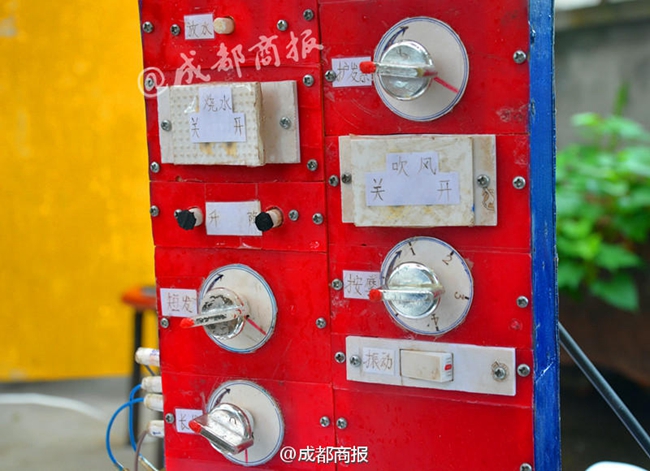 洗頭機系一個鐵架子頂部掛著摩托車頭盔,旁邊擺著兩個塑料水箱,還有一塊控制面板……陳攻科的父親陳述明帶上防水圍脖,坐在椅子上,輕輕按下一個按鈕,摩托車頭盔自動下降罩在他頭上,他再次按下按鈕,摩托車頭盔便在他頭上擺動按摩起來。