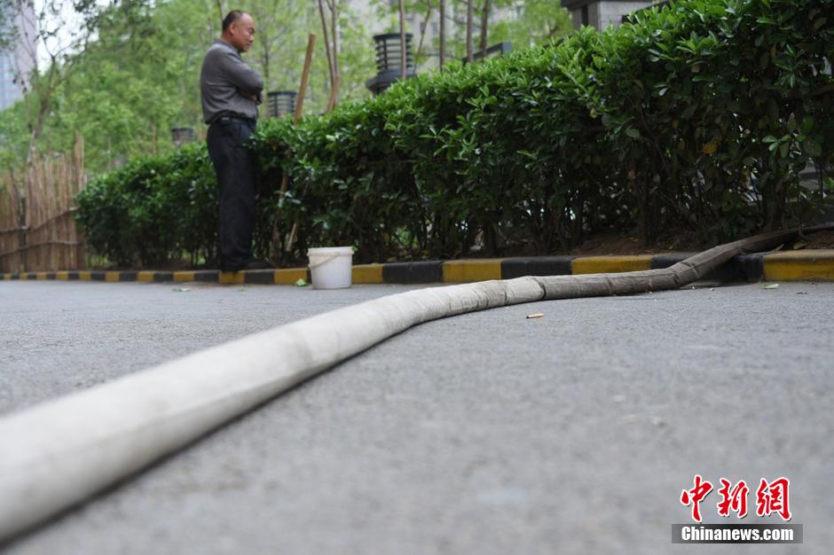 水管是從20樓放下來的,小菜園的主人用它來澆水?!蔽磥砺费卜狸爢T司廣紅說。在小菜園旁邊站著一名中年男子,手里拿著鐵锨。男子說,他是燕莊村民,姓張,家住9號樓20層。 李四信 攝 圖片來源:視覺中國