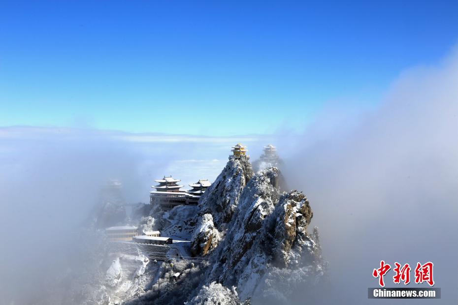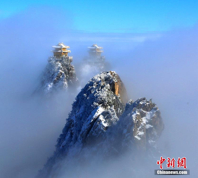 1月7日,連續(xù)降雪之后,位于河南洛陽(yáng)的道教圣地老君山雪后初晴,海拔2000米的伏牛山主峰上,白雪皚皚、銀裝素裹,加之云海浮現(xiàn)與藍(lán)天白云交相輝映,絕壁道觀似瓊樓玉宇幻如仙境美不勝收。 圖為海拔2000米的絕壁道觀幻如仙境。王中舉 攝