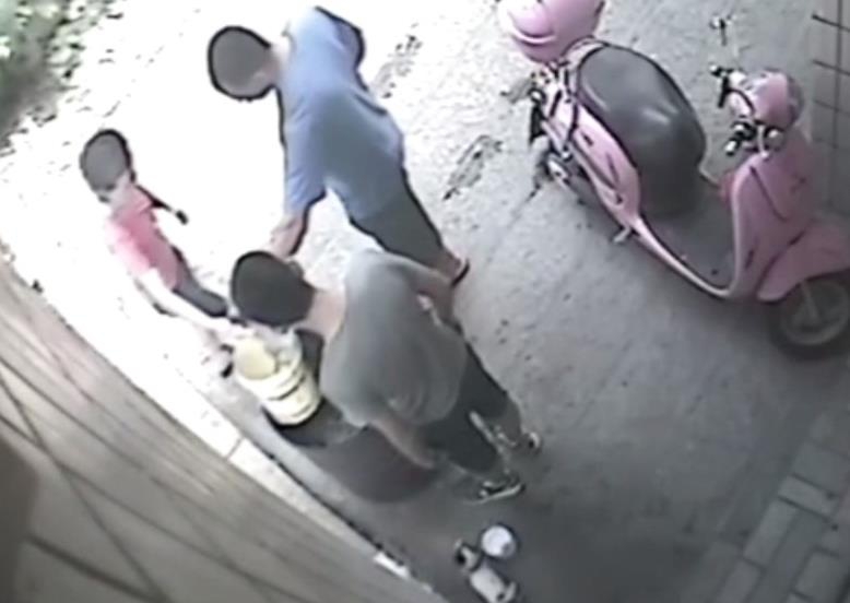 “然后我們以為那個小狗,那個桶那么高,它怎么能跳進(jìn)去。然后我們就調(diào)監(jiān)控,發(fā)現(xiàn)是鄰居家小孩做的?!眻D為男童抓起小狗將其扔進(jìn)火盆。
