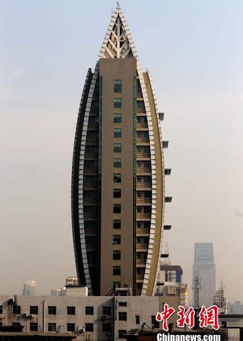 鄭州市環(huán)境保護局辦公大樓有19層高,從下面往上看,下邊窄,中間橢圓,頂部尖,頂端部分還有“葉脈”,邊緣有毛狀物,整體極像一片橢圓形的“樹葉”。