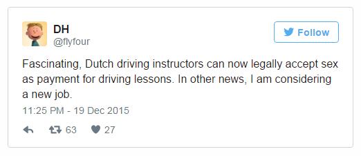 據(jù)荷蘭新聞(Dutchnews)網(wǎng)站12月14日報道了該國議會一件令人震驚的決議——駕校教練可以用性回報代替現(xiàn)金來收費。這一消息引起媒體大嘩,大約一周后(21日),各國媒體議論紛紛。赫芬頓郵報的副標題就是“Ride for a ride”意為可以用性來換一段路程,CNN報道稱:“Go Dutch”現(xiàn)在有了新的意味,因為歐洲男性開始涌向荷蘭,遞交擔任駕校教練申請。根據(jù)荷蘭政府方面的消息,申請量比之前增加了5倍。