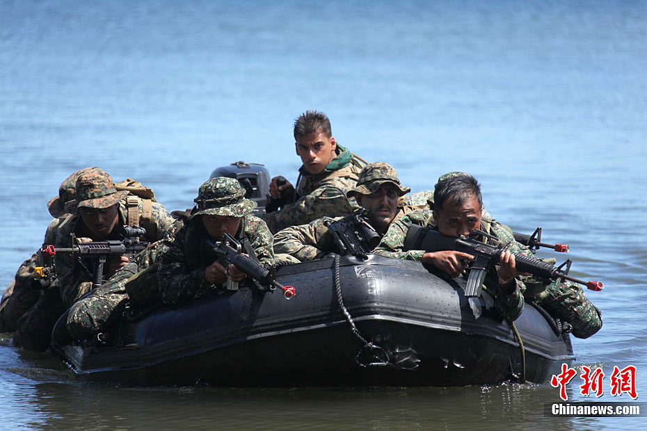 4月25日,美國(guó)與菲律賓“肩并肩2012”聯(lián)合軍演參演部隊(duì)在菲律賓南部巴拉望省普林塞薩港市的阿魯甘灣舉行“兩棲登陸”演練,美菲雙方近百名海軍陸戰(zhàn)隊(duì)士兵參加。這也是美菲“肩并肩2012”聯(lián)合軍演開幕10天以來(lái),開放媒體采訪規(guī)模最大的一場(chǎng)軍事演習(xí)活動(dòng)。圖為美菲海軍陸戰(zhàn)隊(duì)士兵混合編隊(duì),搭乘小艇抵達(dá)演習(xí)地點(diǎn)。張明 攝