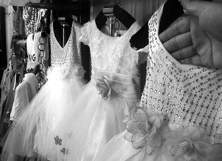 “這個送珍珠腰帶,走(賣)得可好,帶一件吧!”昨天下午2點(diǎn),鄭州市豐產(chǎn)路某店鋪內(nèi),女老板正在向一位女士推銷熱賣的“公主裙”。仔細(xì)看,這條粉紅色的裙子,腰間綴著由花生米大小的“珍珠”做的腰帶,袖口邊緣處還貼著亮閃閃的貼片,看著確實(shí)華麗。經(jīng)過一番討價還價,該女士花100元為上幼兒園的女兒買了條裙子。令她不滿意的地方,就是似乎珍珠腰帶縫得并不緊,“珍珠是一根單線穿下來的,穿不了幾次,就該斷了”。