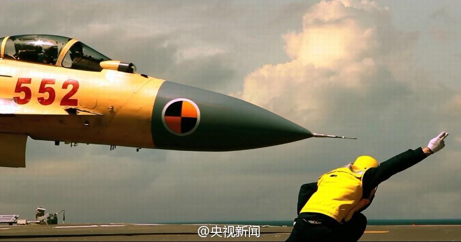 昨天,央視新聞首先在節(jié)目中播出這一視頻。視頻配以恢宏的音樂,記錄了殲15艦載機在遼寧艦上起飛、著艦的畫面。視頻以飛行員的日?;居柧氉鳛殚_頭,描述了飛行員做起飛前的準備工作、飛行中駕駛飛機及著陸的狀態(tài)。值得注意的是,視頻中,還有近10秒時間展示了殲15在空中進行特技飛行動作的畫面,飛行員駕駛飛機進行翻轉(zhuǎn),畫面中天空與地面的位置調(diào)轉(zhuǎn)。
