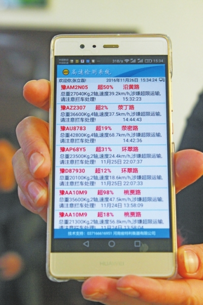 超載信息通過監(jiān)控裝置實(shí)時(shí)傳輸?shù)街登诮痪氖謾C(jī)中。