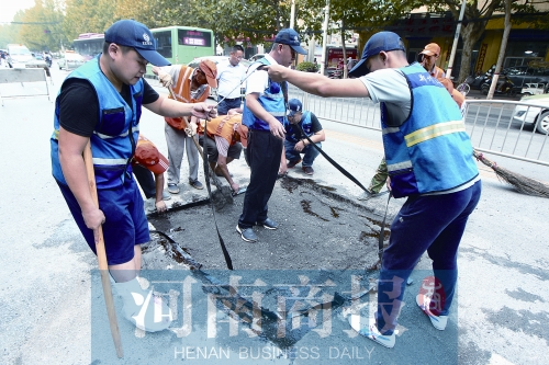 臺(tái)風(fēng)“天鴿”讓鄭州下了幾天的雨,許多道路積水塌方車輛陷進(jìn)去。中央氣象臺(tái)預(yù)報(bào)臺(tái)風(fēng)“帕卡”已經(jīng)登陸南方,受其影響鄭州又將面臨幾天的降雨,道路養(yǎng)護(hù)工們要趕在降雨前修復(fù)路面坑槽,預(yù)防各種危害的發(fā)生。