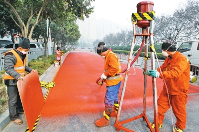 “機(jī)動(dòng)車道6米寬,鋪設(shè)‘綠道’的自行車道也為6米寬??磻T了灰黑色的路面,在看到色彩明銳的‘綠道’后肯定覺得眼前一亮?!G道’只是叫法,并不是說道路外觀一定是綠色的,在景觀設(shè)計(jì)中,‘綠道’往往有著更深更廣的內(nèi)涵?!惫こ特?fù)責(zé)人呂先生告訴記者,彩色瀝青厚度僅為1到2毫米,壽命在5年以上,具有警示、防滑、降噪、美觀等特點(diǎn)。“我國‘綠道’通常以警示色紅色為主打,主要作用是打造人車分離模式,供騎車者和步行者休閑使用。”